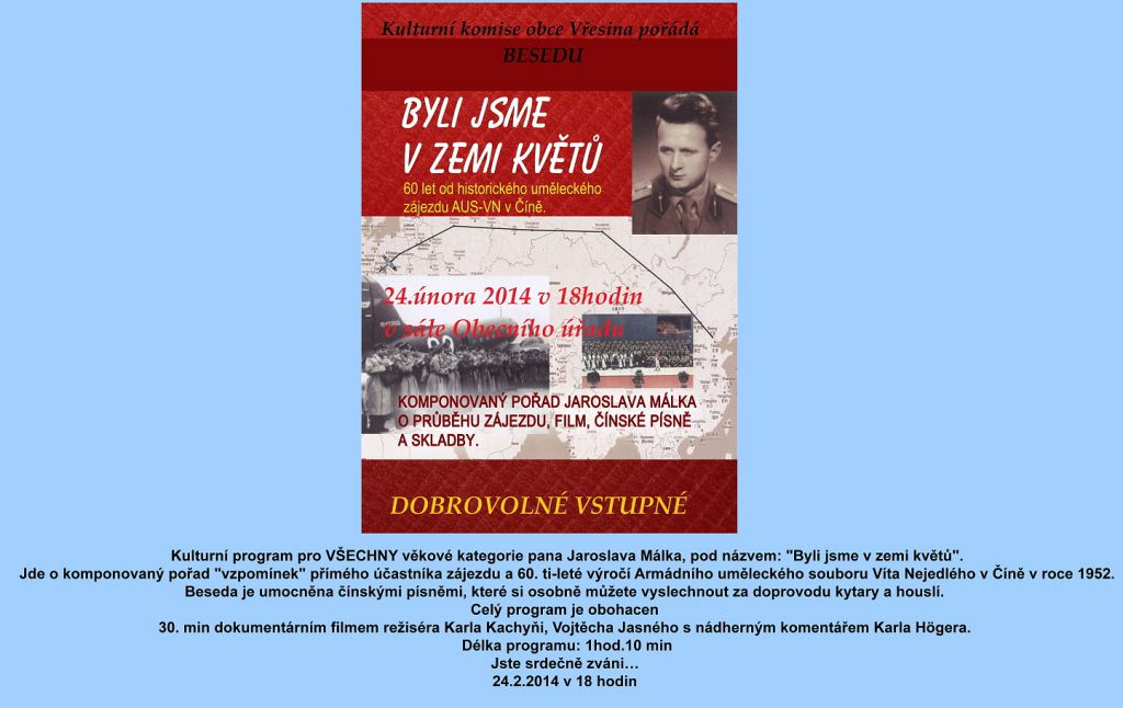 Jde o komponovaný pořad "vzpomínek" přímého účastníka zájezdu a 60. ti-leté výročí zájezdu Armádního uměleckého souboru Víta Nejedlého v Číně v roce 1952.